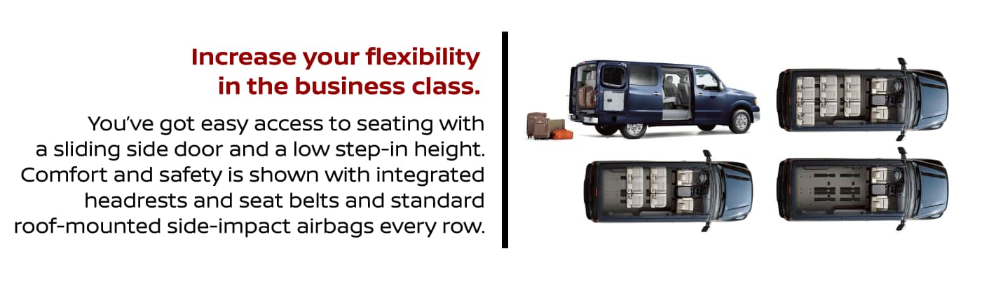 Nissan NV3500® HD SL Passenger shown in Super Black. 1Based on Global Automakers of Canada (GAC) Full Size Van Market Segmentation. MY18 NV vs. 2018 and 2017 Full Size Van Class sourced from Autodata on November 22, 2017. 2Airbags are only a supplemental restraint system; always wear your seat belt. Rear-facing child restraints should not be placed in the front-passenger's seat. Also, in addition to any other requirement of applicable law, all children 12 and under should ride in the rear seat properly secured in child restraints, booster seats, or seat belts according to their size. Airbags will only inflate in certain accidents; see your Owner's Manual for more details. Requires accessory tow hitch receiver. See Nissan Towing Guide and Owner's Manual for additional information. With the 2018 Nissan NV Passenger, there's always room for more. Whether it's sharing a multi-family vacation, taking little leaguers and gear to the game, or being the king of the carpool, NV Passenger transports your expectations as well as your passengers. You've got easy access to seating with a sliding side door and a low step-in height. Confidence comes along for the ride with integrated headrests and seat belts and standard roof-mounted side-impact supplemental airbags with rollover sensor for every row.2 Innovative heating and cooling keeps everyone comfortable, too. The out-front engine design provides improved driver comfort, easier engine access for servicing, the durability of a full-length, fully boxed ladder frame, and the biggest brakes in its class.1 It all adds up to a team player we can all cheer for. 2018 NV Passenger. NV PASSENGER ROOM FOR 12 AND A BEST-IN-CLASS 324 SEATING CONFIGURATIONS1 NV® PASSENGER NV Passenger not only gives you space, it gives you unbeatable flexibility when it comes to carrying passengers and cargo. A choice of fore or aft positions in the 2nd- and 3rd-row seats means impressive stretch-out room; a real plus for taller or larger family members. And with six individually removable seats, you can do amazing things like having room for eight while fitting items up to ten feet long - all without the hassle of using a roof rack.1 PACK IT IN, MOVE 'EM OUT 1Cargo and load capacity limited by weight and distribution. Always secure all cargo. Heavy loading of the vehicle with cargo, especially on the roof, will affect the handling and stability of the vehicle. Maximum passengers Easy entry and exit Room for eight and cargo1 Up to 10' long items1 Maximum cargo1 NV® PASSENGER NCVC_18NVCPb_14-15_EN_r1.indd 14 11/30/17 10:24 AM Opens wide and says more. NV Passenger makes it easy to use every inch of space. The rear doors swing wide, opening 243°, and are held in place with powerful magnetic door stops. The easy-sliding side door opens wide and features a low step-in height. And when you need to make the big haul, remove the 2nd-, 3rd-, and 4th-row seats, and enjoy a massive 218.9 cu. ft. (6,198 litres) of cargo space.1 Nissan NV3500® HD SL Passenger shown in Beige Leather. U.S. instrumentation shown. Up to 10' long items1 Maximum cargo1 NCVC_18NVCPb_14-15_EN_r1.indd 15 11/30/17 10:24 AM Driving isn't just driving anymore. With today's crazy schedules, you can end up feeling like a part-time skycap, cashier, entertainment director - even company representative. No matter which hat you end up wearing today, NV Passenger helps you excel at all of them, providing outstanding room and superior visibility for easier manoeuvring. There's dedicated storage to help keep things in order, and available advanced technology to help keep you on time. Job well done. Never miss a beat with standard Hands-free Text Messaging Assistant,2 Bluetooth® hands-free calling,3 and RearView Monitor.4 Or take it to the next level with NissanConnectSM Mobile Apps.3 It serves up a suite of high-tech features to help you keep you in business, easily accessed through a 5.8" (147 mm) touch-screen display with Voice Recognition. And with technology including the Advanced Nissan Navigation System,5 NissanConnect Mobile Apps,3 Nissan Voice Recognition for audio and navigation,5 and SiriusXM® Traffic,3 you're in touch with the things that matter most. Best of both worlds. Whether it's running a business, or just keeping a big team on the go, NV Passenger uses some smart thinking to help keep things organized. The lockable centre console is roomy enough for a laptop computer and hanging files, while the sliding cover makes a great work desk. Fold the front passenger seat and you've got even more workspace, or a handy tray when grabbing a bite on the road. And with the under-seat storage drawer, you've got a secure place to store loose papers. 1 COMFORT, CONTROL, AND CONVENIENCE BECAUSE BUSINESS IS ALL ABOUT CONNECTIONS YOUR PERSONAL ORGANIZER 1Cargo and load capacity limited by weight and distribution. Always secure all cargo. Heavy loading of the vehicle with cargo, especially on the roof, will affect the handling and stability of the vehicle. 2Use the Text Messaging feature after stopping your vehicle in a safe location. If you have to use the feature while driving, exercise extreme caution at all times so full attention may be given to vehicle operation. Compatible smartphone required. Standard text rates and/or data usage may apply. 3Available services/features may be shown. Compatible connected device may be required. Only use services/features and device when safe and legal to do so. Subject to GPS and wireless network availability and connection, and system/technology limitations. Text rates/data usage/subscription may apply. Some services/ features provided by companies not within Nissan or its partners' or agents' control and may be discontinued at any time. For more information, see Dealer or Owner's Manual. 4Parking aid/convenience feature. Cannot completely eliminate blind spots. May not detect every object and does not warn of moving objects. Always check surroundings and turn to look behind you b