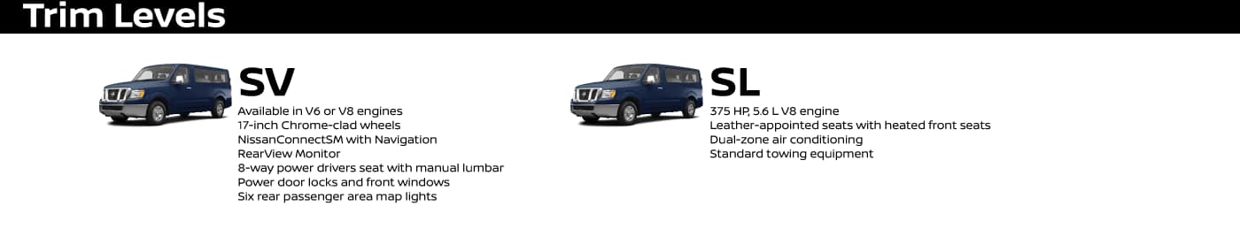 Nissan NV3500® HD SL Passenger shown in Super Black. 1Based on Global Automakers of Canada (GAC) Full Size Van Market Segmentation. MY18 NV vs. 2018 and 2017 Full Size Van Class sourced from Autodata on November 22, 2017. 2Airbags are only a supplemental restraint system; always wear your seat belt. Rear-facing child restraints should not be placed in the front-passenger's seat. Also, in addition to any other requirement of applicable law, all children 12 and under should ride in the rear seat properly secured in child restraints, booster seats, or seat belts according to their size. Airbags will only inflate in certain accidents; see your Owner's Manual for more details. Requires accessory tow hitch receiver. See Nissan Towing Guide and Owner's Manual for additional information. With the 2018 Nissan NV Passenger, there's always room for more. Whether it's sharing a multi-family vacation, taking little leaguers and gear to the game, or being the king of the carpool, NV Passenger transports your expectations as well as your passengers. You've got easy access to seating with a sliding side door and a low step-in height. Confidence comes along for the ride with integrated headrests and seat belts and standard roof-mounted side-impact supplemental airbags with rollover sensor for every row.2 Innovative heating and cooling keeps everyone comfortable, too. The out-front engine design provides improved driver comfort, easier engine access for servicing, the durability of a full-length, fully boxed ladder frame, and the biggest brakes in its class.1 It all adds up to a team player we can all cheer for. 2018 NV Passenger. NV PASSENGER ROOM FOR 12 AND A BEST-IN-CLASS 324 SEATING CONFIGURATIONS1 NV® PASSENGER NV Passenger not only gives you space, it gives you unbeatable flexibility when it comes to carrying passengers and cargo. A choice of fore or aft positions in the 2nd- and 3rd-row seats means impressive stretch-out room; a real plus for taller or larger family members. And with six individually removable seats, you can do amazing things like having room for eight while fitting items up to ten feet long - all without the hassle of using a roof rack.1 PACK IT IN, MOVE 'EM OUT 1Cargo and load capacity limited by weight and distribution. Always secure all cargo. Heavy loading of the vehicle with cargo, especially on the roof, will affect the handling and stability of the vehicle. Maximum passengers Easy entry and exit Room for eight and cargo1 Up to 10' long items1 Maximum cargo1 NV® PASSENGER NCVC_18NVCPb_14-15_EN_r1.indd 14 11/30/17 10:24 AM Opens wide and says more. NV Passenger makes it easy to use every inch of space. The rear doors swing wide, opening 243°, and are held in place with powerful magnetic door stops. The easy-sliding side door opens wide and features a low step-in height. And when you need to make the big haul, remove the 2nd-, 3rd-, and 4th-row seats, and enjoy a massive 218.9 cu. ft. (6,198 litres) of cargo space.1 Nissan NV3500® HD SL Passenger shown in Beige Leather. U.S. instrumentation shown. Up to 10' long items1 Maximum cargo1 NCVC_18NVCPb_14-15_EN_r1.indd 15 11/30/17 10:24 AM Driving isn't just driving anymore. With today's crazy schedules, you can end up feeling like a part-time skycap, cashier, entertainment director - even company representative. No matter which hat you end up wearing today, NV Passenger helps you excel at all of them, providing outstanding room and superior visibility for easier manoeuvring. There's dedicated storage to help keep things in order, and available advanced technology to help keep you on time. Job well done. Never miss a beat with standard Hands-free Text Messaging Assistant,2 Bluetooth® hands-free calling,3 and RearView Monitor.4 Or take it to the next level with NissanConnectSM Mobile Apps.3 It serves up a suite of high-tech features to help you keep you in business, easily accessed through a 5.8" (147 mm) touch-screen display with Voice Recognition. And with technology including the Advanced Nissan Navigation System,5 NissanConnect Mobile Apps,3 Nissan Voice Recognition for audio and navigation,5 and SiriusXM® Traffic,3 you're in touch with the things that matter most. Best of both worlds. Whether it's running a business, or just keeping a big team on the go, NV Passenger uses some smart thinking to help keep things organized. The lockable centre console is roomy enough for a laptop computer and hanging files, while the sliding cover makes a great work desk. Fold the front passenger seat and you've got even more workspace, or a handy tray when grabbing a bite on the road. And with the under-seat storage drawer, you've got a secure place to store loose papers. 1 COMFORT, CONTROL, AND CONVENIENCE BECAUSE BUSINESS IS ALL ABOUT CONNECTIONS YOUR PERSONAL ORGANIZER 1Cargo and load capacity limited by weight and distribution. Always secure all cargo. Heavy loading of the vehicle with cargo, especially on the roof, will affect the handling and stability of the vehicle. 2Use the Text Messaging feature after stopping your vehicle in a safe location. If you have to use the feature while driving, exercise extreme caution at all times so full attention may be given to vehicle operation. Compatible smartphone required. Standard text rates and/or data usage may apply. 3Available services/features may be shown. Compatible connected device may be required. Only use services/features and device when safe and legal to do so. Subject to GPS and wireless network availability and connection, and system/technology limitations. Text rates/data usage/subscription may apply. Some services/ features provided by companies not within Nissan or its partners' or agents' control and may be discontinued at any time. For more information, see Dealer or Owner's Manual. 4Parking aid/convenience feature. Cannot completely eliminate blind spots. May not detect every object and does not warn of moving objects. Always check surroundings and turn to look behind you b