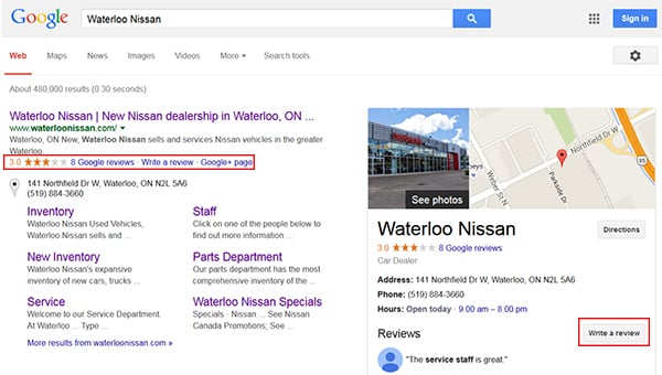 Simply perform a Google search for us here: Waterloo Nissan. Here you can add your review in two ways, as highlighted in red below in the picture